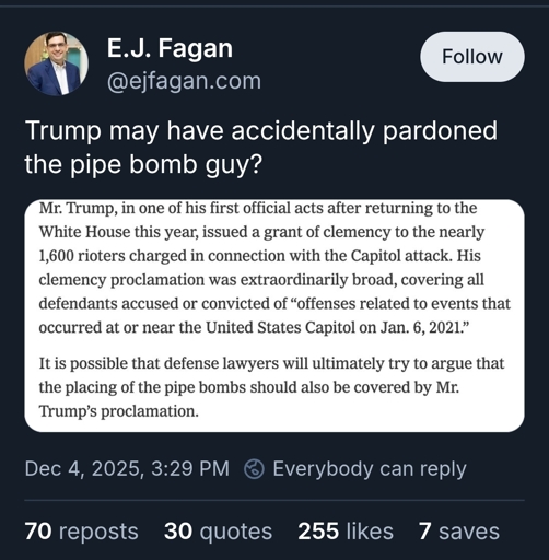 arrow-up11arrow-down1imageHas Trump "Accidently" Already Pardoned Pipe Bomb Guy?plus-squarelemmy.caslothrop@lemmy.caEnglish · 2 months agomessage-square0linkfedilink