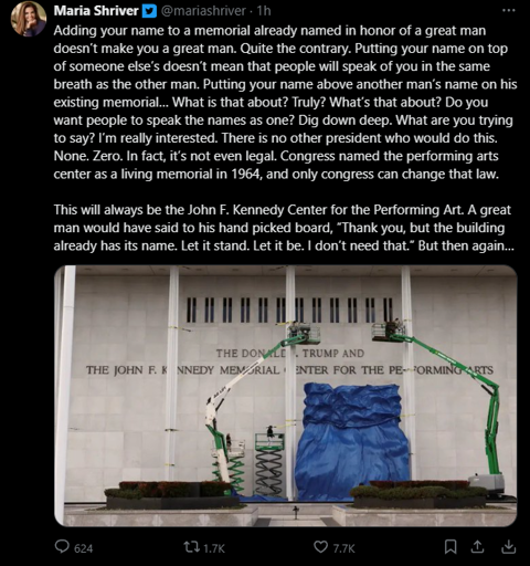 arrow-up11arrow-down1imageShriver criticizing what amounts to vandalism of the JFK Center for the Performing Artsplus-squarelemmy.worldlechekaflan@lemmy.worldEnglish · 1 month agomessage-square0linkfedilink