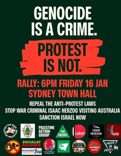 zero_gravitas@aussie.zoneEnglish · 6 days agoRally against anti-protest laws and state visit by Israeli president - Today, 6pm, Sydney Town Hallaussie.zoneimagemessage-square0linkfedilinkarrow-up11arrow-down10