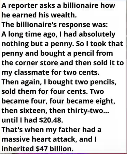 The billionaire’s response was: A long time ago, I had absolutely nothing but a penny. So I took that penny and bought a pencil from the corner store and then sold it to my classmate for two cents.