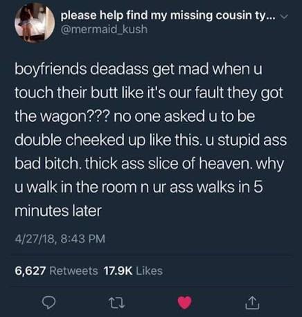 girlfriends deadass get mad when u touch their butt like it’s our fault they got the wagon??? no one asked u to be double cheeked up like this. u stupid ass bad bitch. thick ass slice of heaven. why u walk in the room n ur ass walks in 5 minutes later.
