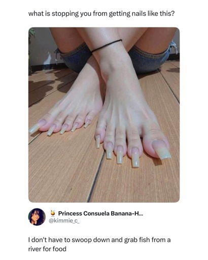 Originally, long nails were a way to indicate that you could avoid manual labor long enough to grow out them out. Essentially the lawn of the hands, opulent keratin. Long toenails indicating that you never even need to walk, and that your sexual partners will die of a staph infection, are an interesting extension.