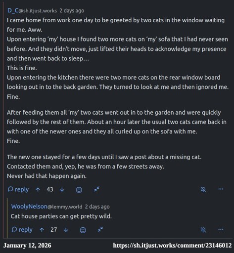 @D_C@sh.itjust.works provides an anecdote about cats in their house, on !cat@lemmy.world https://sh.itjust.works/comment/23146012