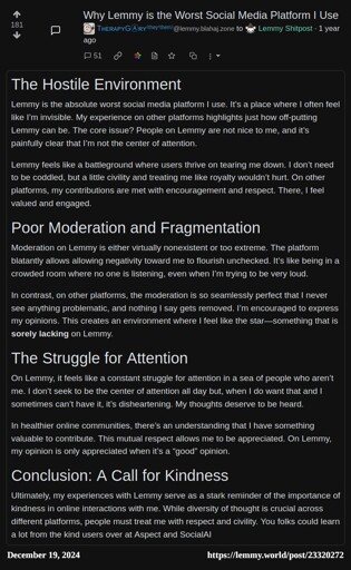 @TherapyGary@lemmy.blahaj.zone explains “Why Lemmy is the Worst Social Media Platform I Use” on !lemmyshitpost@lemmy.world at: https://lemmy.world/post/23320272