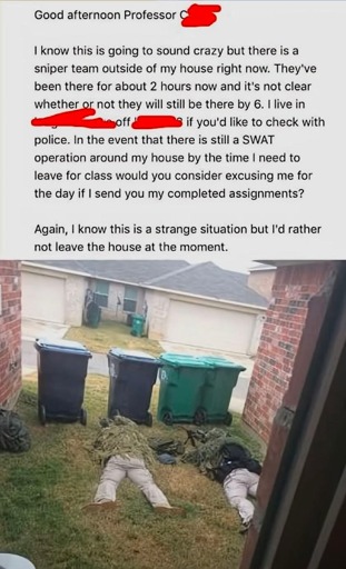 Coworker of mine had sniper’s set up on his front porch and screw tripods into his railing to hold the rifles when the neighbor’s kid had a mental health crisis and threatened suicide.