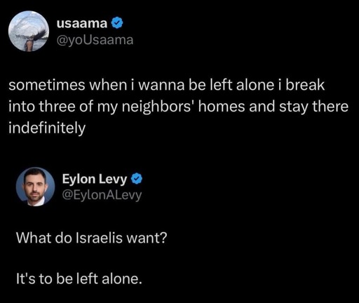 Israel is literally waging a war to expand borders, so yeah, maybe they want to be left alone in the sense that they won’t accept any state other than Israel existing in the end.