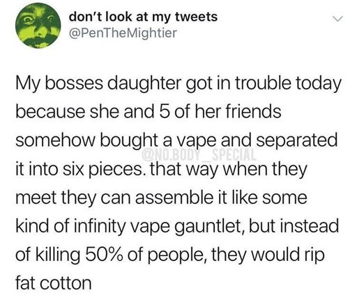 Vapes have cotton inside them, used to wick the vape fluid into the heating coil. The heating coil surrounds the cotton. Ripping a fat bong hit then gets transformed into ripping fat cotton. I guess.