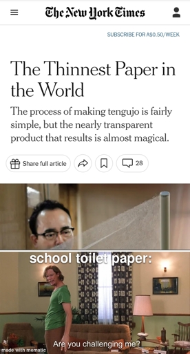 minus-squarerockSlayer@lemmy.worldlinkfedilinkarrow-up1·1 year agoTrust me, the tp doesn’t get better after school. Best tp I’ve ever used from an institution was my college, which was basically 3 ply Scott’s