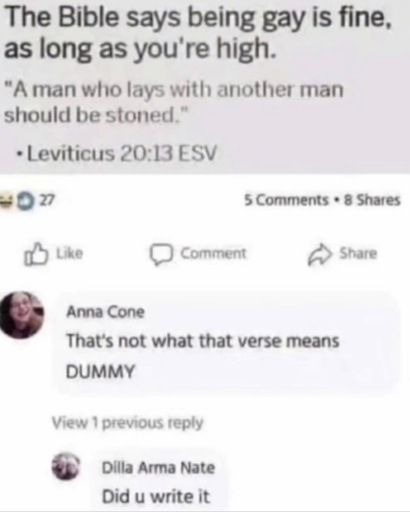 יג וְאִ֗ישׁ אֲשֶׁ֨ר יִשְׁכַּ֤ב אֶת־זָכָר֙ מִשְׁכְּבֵ֣י אִשָּׁ֔ה תּֽוֹעֵבָ֥ה עָשׂ֖וּ שְׁנֵיהֶ֑ם מ֥וֹת יוּמָ֖תוּ דְּמֵיהֶ֥ם בָּֽם: