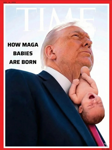 The main joke is that Trump’s jowls look like a vagina, it’s often referred to as a “nussy.” During natural childbirth the exit is through the vagina, that’s why MAGA babies exit there, instead of any orifice. I do like the imagery you describe, since it’s clear anyone in MAGA clearly has their head up Trump’s ass.