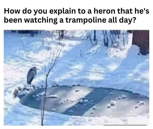 If a woman got on the trampoline she’d be the heroine of the heron’s heroin religion.