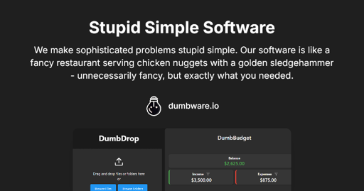 mfat@lemmy.ml to Selfhosted@lemmy.worldEnglish · 1 year agoDumbware.io - Stupid Simple Softwarewww.dumbware.ioexternal-linkmessage-square15linkfedilinkarrow-up13arrow-down10