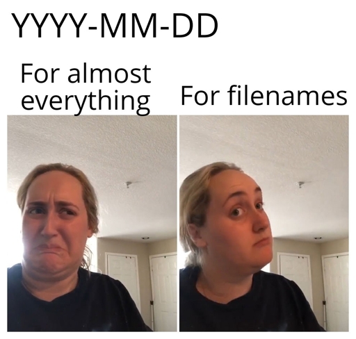 minus-squareunomar@midwest.sociallinkfedilinkEnglisharrow-up0·2 years agoISO-8601 over all other formats. 2023-08-09T21:11:00Z Simple, sortable, intuitive.