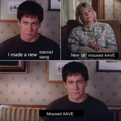 3 panel meme. First panel: “I made a new internet slang”. Second panel: “New or misused AAVE?” Third panel: “Misused AAVE”.