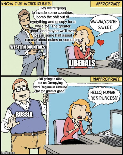 jackeroni@lemmy.ml to Memes@lemmy.ml · 7 months agoLiberals: its ok as long as the west does it! 😁lemmy.mlimagemessage-square22linkfedilinkarrow-up136arrow-down1148