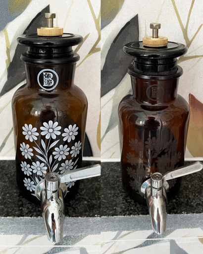 I love laser etched glass but it would show up much more on clear glass. So if you’re set on brown glass, then left one looks better to me…from the picture. Now if it shows up to you in person enough that you can make out the motifs then, I would pick etched over heat printed.