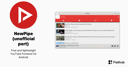 NOTE: This is an unofficial and experimental Flatpak build based on Android Translation Layer. Please report bugs to the ATL bug tracker instead of the NewPipe bug tracker https://gitlab.com/android_translation_layer/android_translation_layer/-/issues.