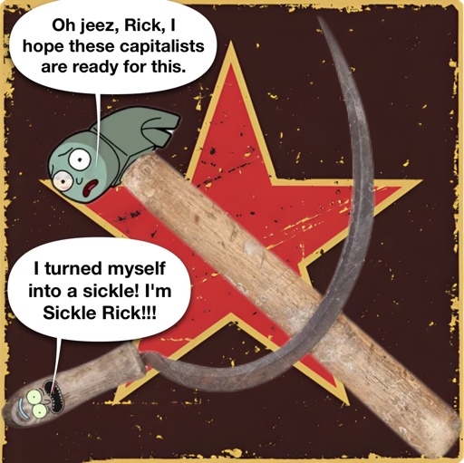 Abolish Amerikkka@lemmygrad.ml to Memes@lemmy.ml · 2 years agoI turned myself into a sickle! I'm Sickle Rick!!!plus-squarelemmygrad.mlimagemessage-square0linkfedilinkarrow-up11arrow-down10